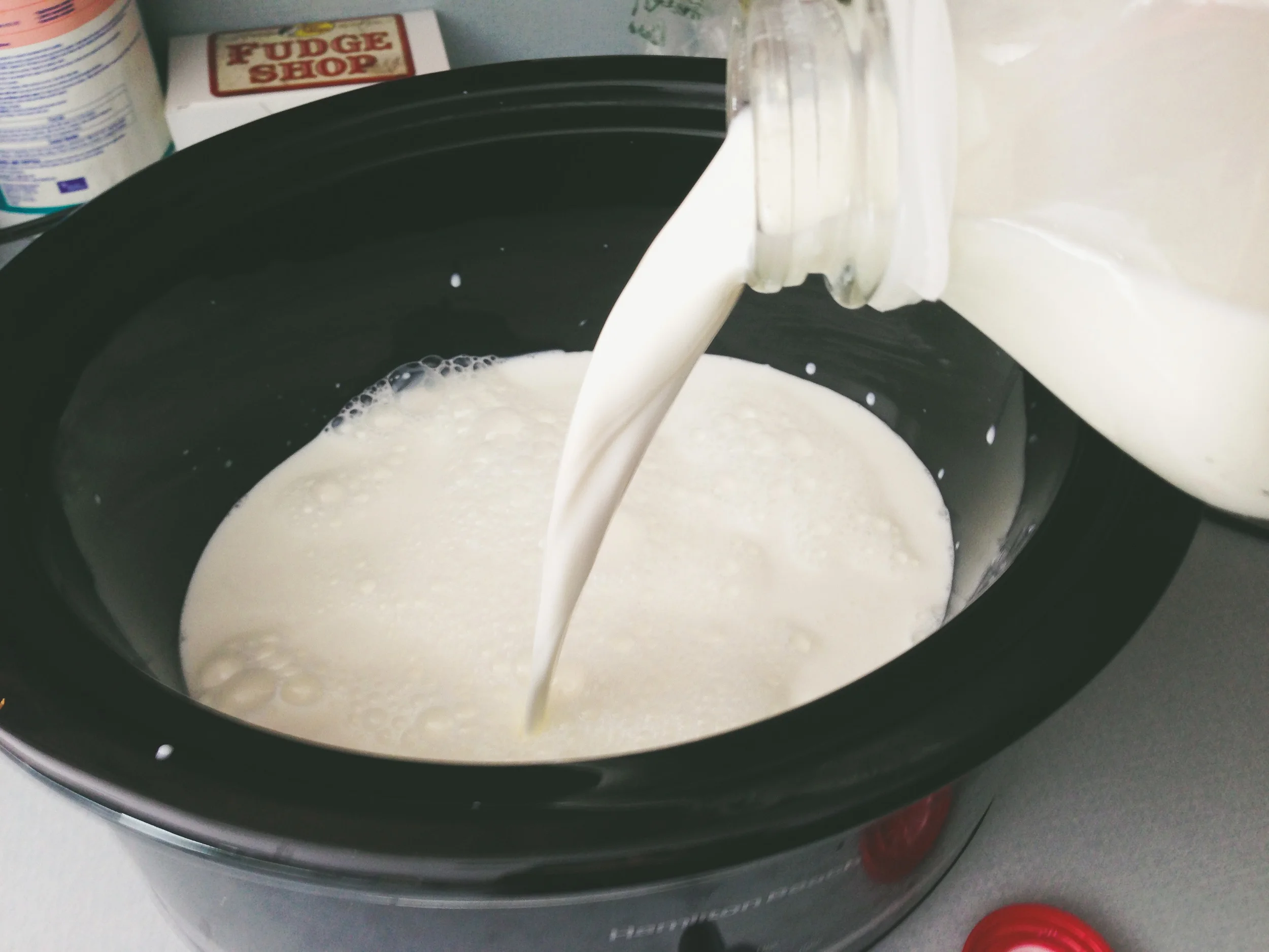 Pour the half gallon of milk into the crock pot (make sure it's clean!) and turn it on low for 2 hours and 45 minutes.