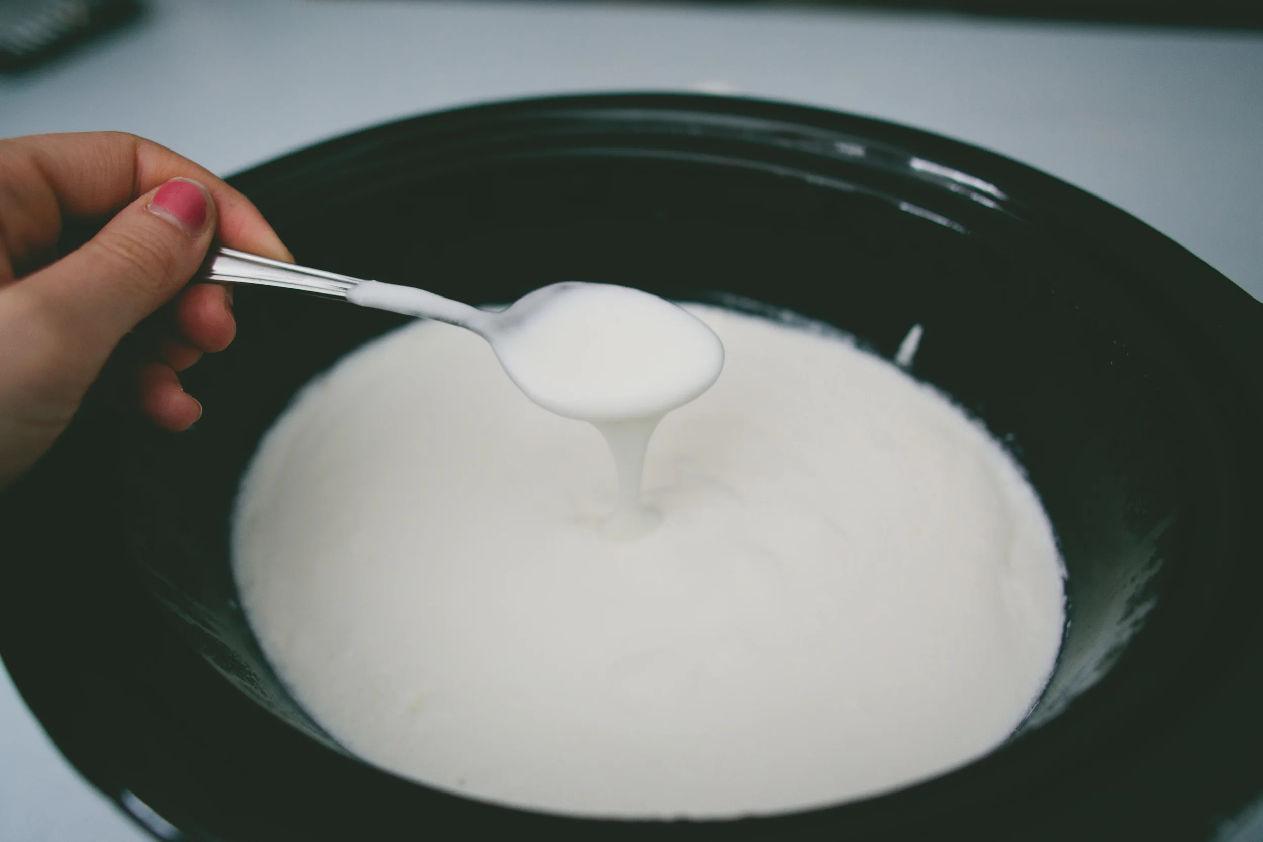 After 3 hours, spoon a small amount of the milk into a bowl. Mix your 1/2 cup of yogurt in with the milk and then dump the mixture back into the crock pot. Mix thoroughly. At this point we added about a 1/2 tablespoon of vanilla extract for flavoring.