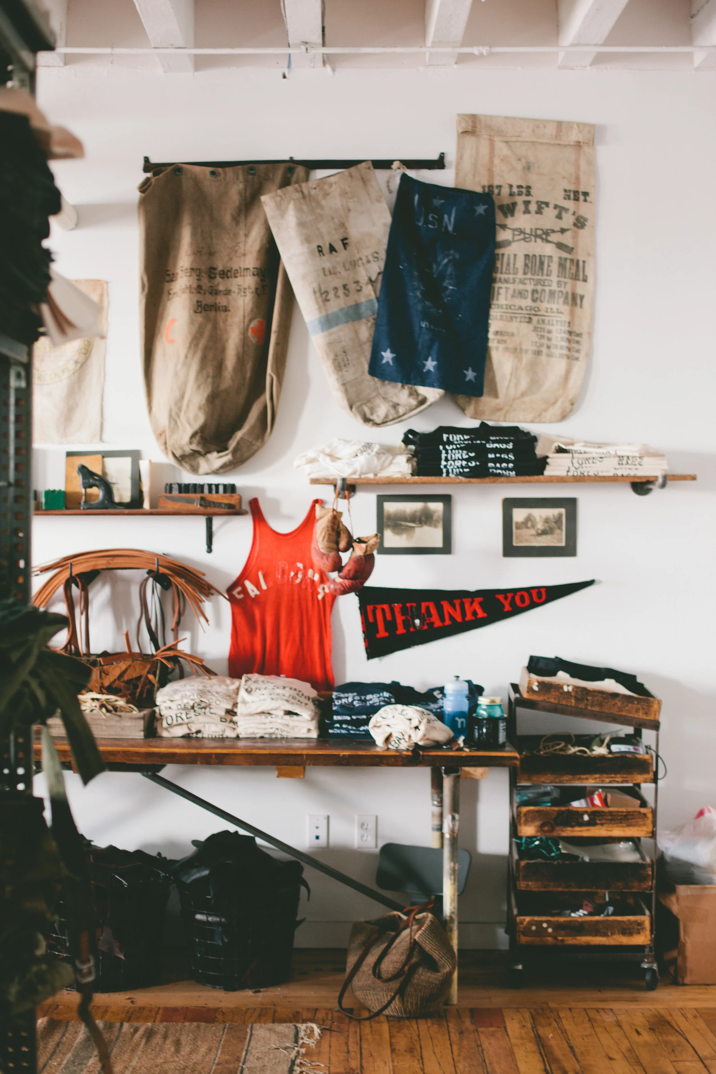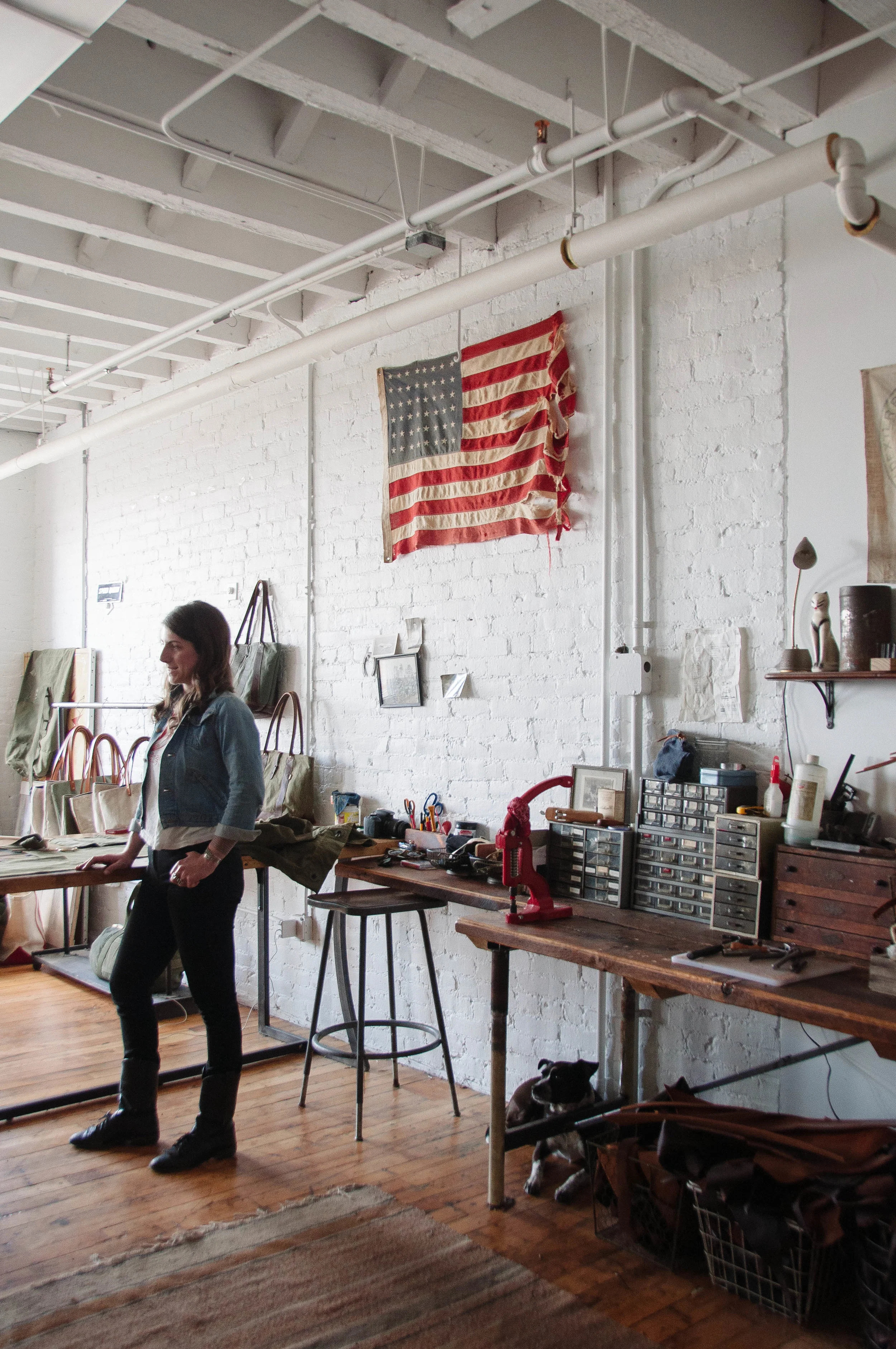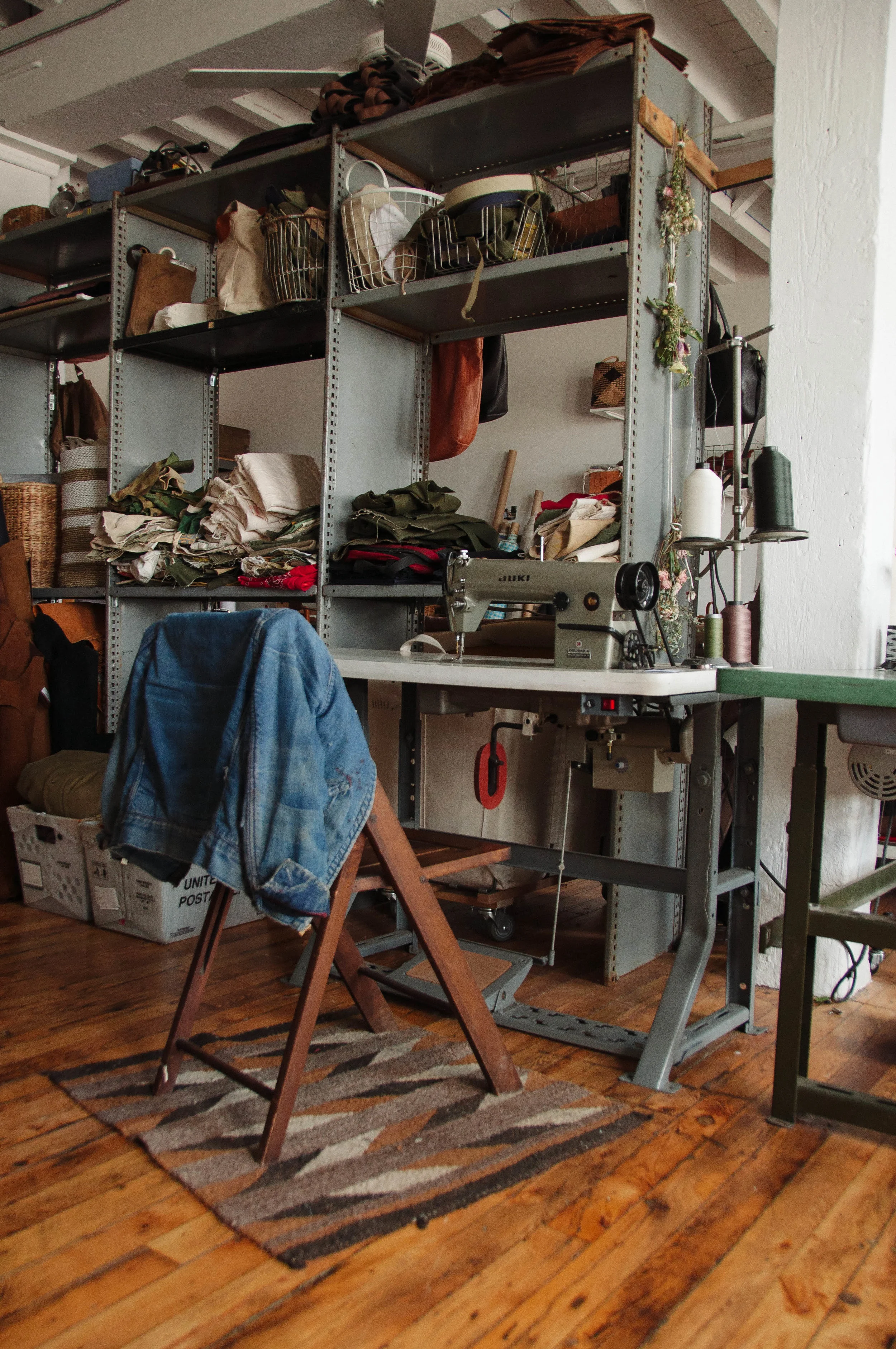 We visited Alice and the Forestbound studio one Saturday in April. Her studio itself is a work of art - history is captured in the textiles and duffel bags that adorn the white, concrete walls. Sunlight spills onto the hardwood floors that are scattered with hand-made bags that use decades-old material, rich with a story to tell. Her adorable rescue dog, Maisey, watches over the studio while we move about, admiring everything with a delicate awe as if it was a neatly curated museum. And in a way, it is a museum. History plays as much a part of Forestbound as the bags do themselves. Beyond the materials that Alice uses, all the hand tools and sewing machines have a story to tell. Collected over the years at antique stores and flea markets and restored to a working state, the tools are found items that are beautifully worn and gently used. The sewing machines - or "workhorses" as she refers to them as, are from the mid-70's and were purchased from a father/son duo based in Fall River, MA who own a warehouse full of sewing machines that date back to the times when textile manufacturing was a great source of income for New England.