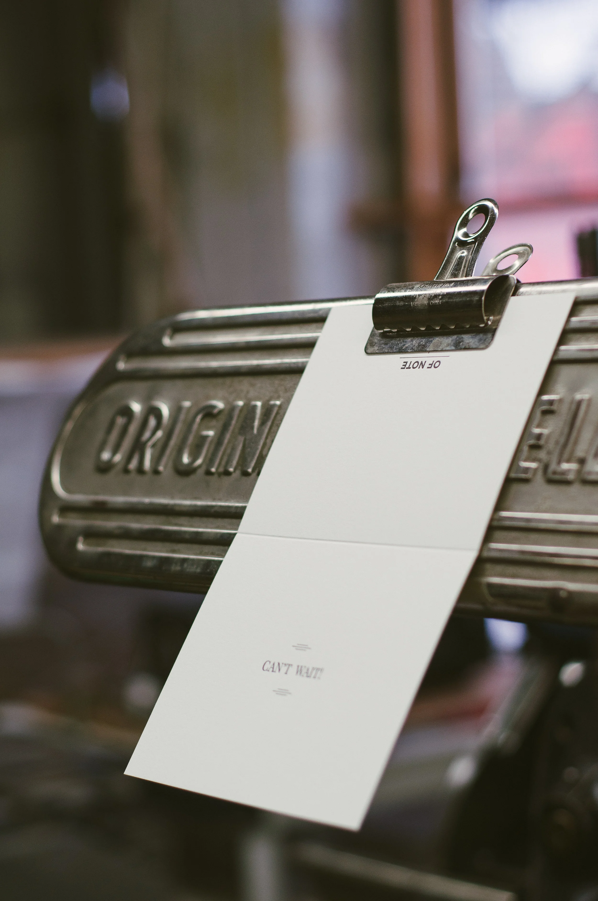 A key partner in Kate and Isabelβs mission to keep the art of letter writing alive is Mike Dacey of Repeat Press in Somerville, Massachusetts. Repeat is a letterpress studio focused on bringing everything from packaging to business cards to life using centuries-old production methods and machinery, and a βdash of modern technology.β They were a natural fit for Of Note, bringing their simple, stunning cards to life using traditional presses. All of Repeatβs presses were built between 1920 and 1960, and all have origins within New England, from Rhode Island to Western Massachusetts, and even one press purchased from an art teacher at a Brookline, Massachusetts school.